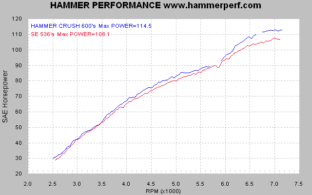 Check out these dyno results! These were taken on a 2007 XL1200 equipped with an Air Hammer air cleaner and the exhaust as shown. Tuned with a Dynojet Powervision. Click for larger view.