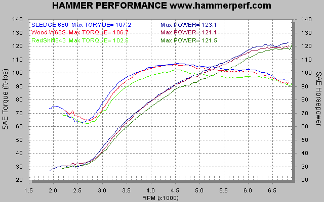 Sledge 660 vs Wood W68S vs. RS643 dyno chart