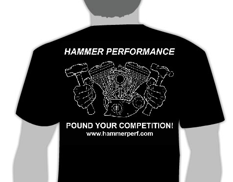 Probably our single most requested item, HAMMER PERFORMANCE is now making T-shirts available! Show the rest of the world that your Harley or Buell has only the finest performance parts in it. 100% pre-shrunk cotton available in a wide range of sizes. Available Now!
